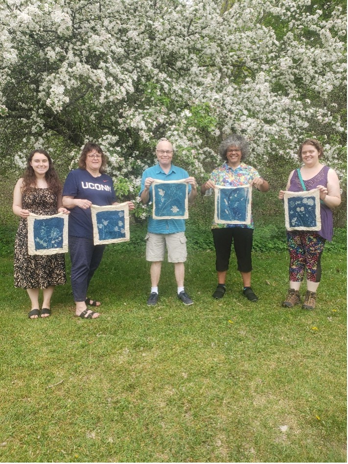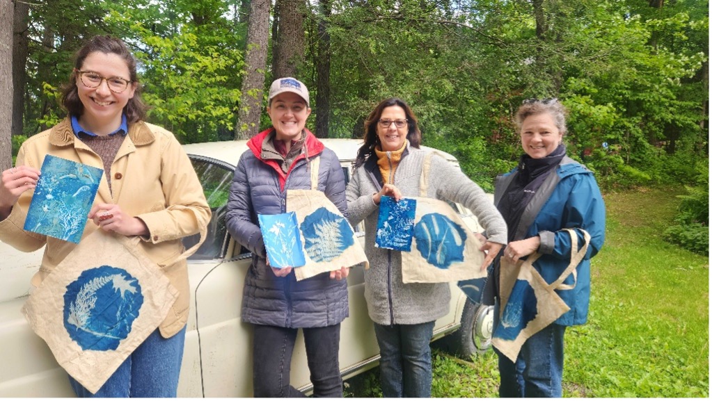 Cyanotype workshop participants with paper prints and cotton tote bags ⒸMadge Evers