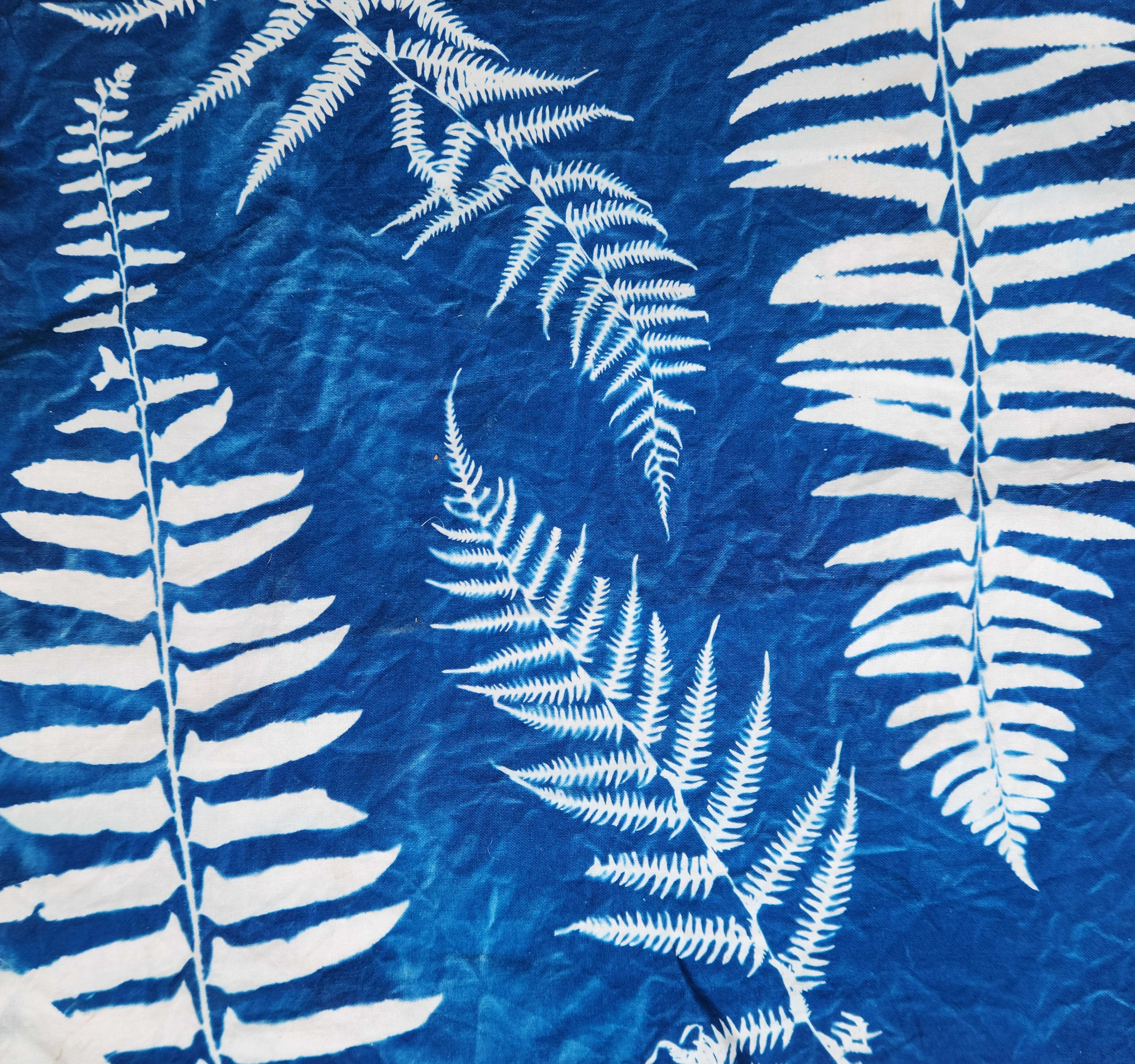 Each piece begins with the simple act of arranging plant material on natural fabric — cotton, linen, or silk — treated with a light-sensitive solution. After exposure to sunlight and a rinse with water, the image emerges in vibrant Prussian blue, a hue that has become synonymous with the cyanotype tradition.