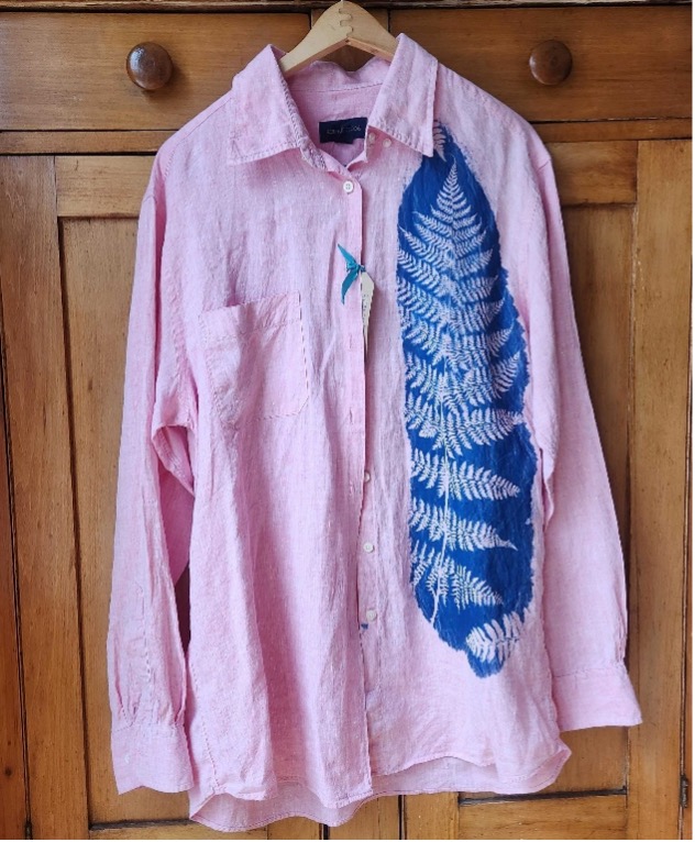 Madge’s creative exploration extends beyond fine art prints to wearable cyanotype pieces, such as upcycled linen shirts and cotton tote bags.